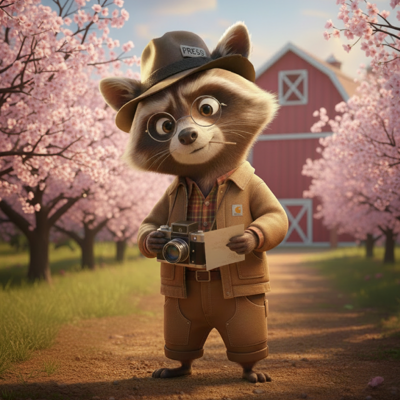 Mr. E. is a sharp-eyed raccoon reporter who loves clues, cameras, and a good headline. If something strange happens in the orchard, he’s already writing about it.